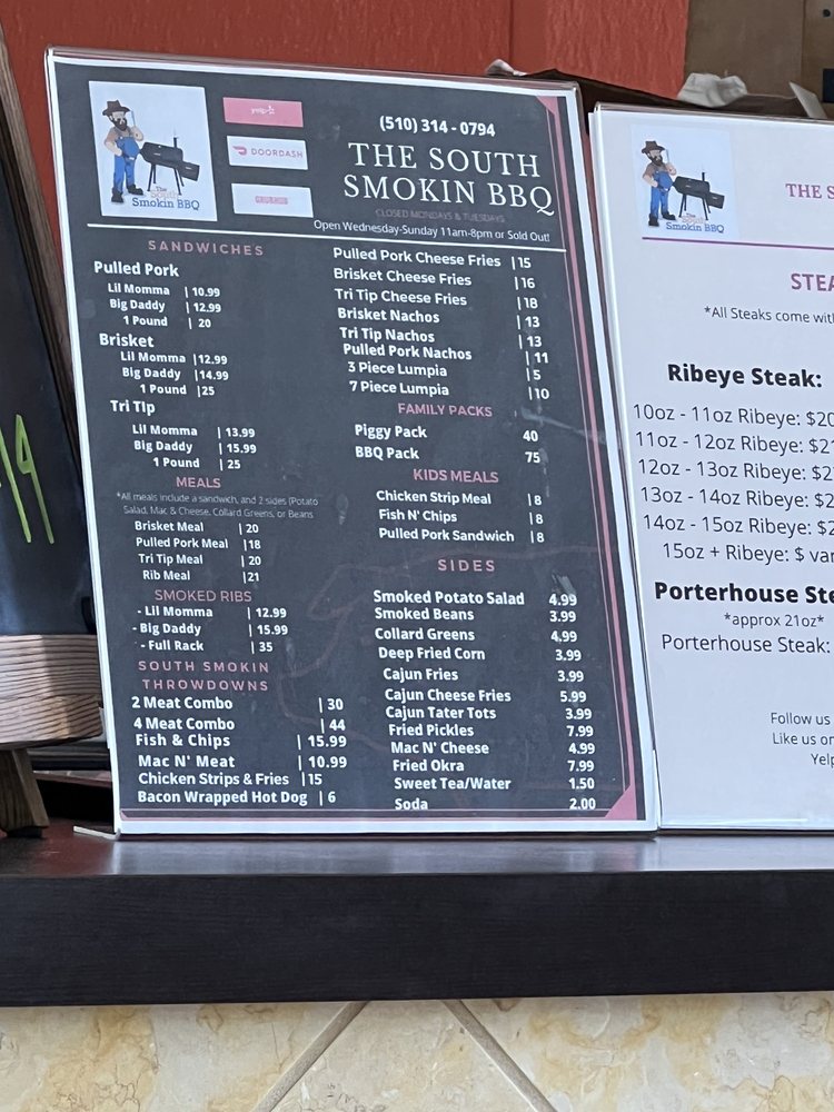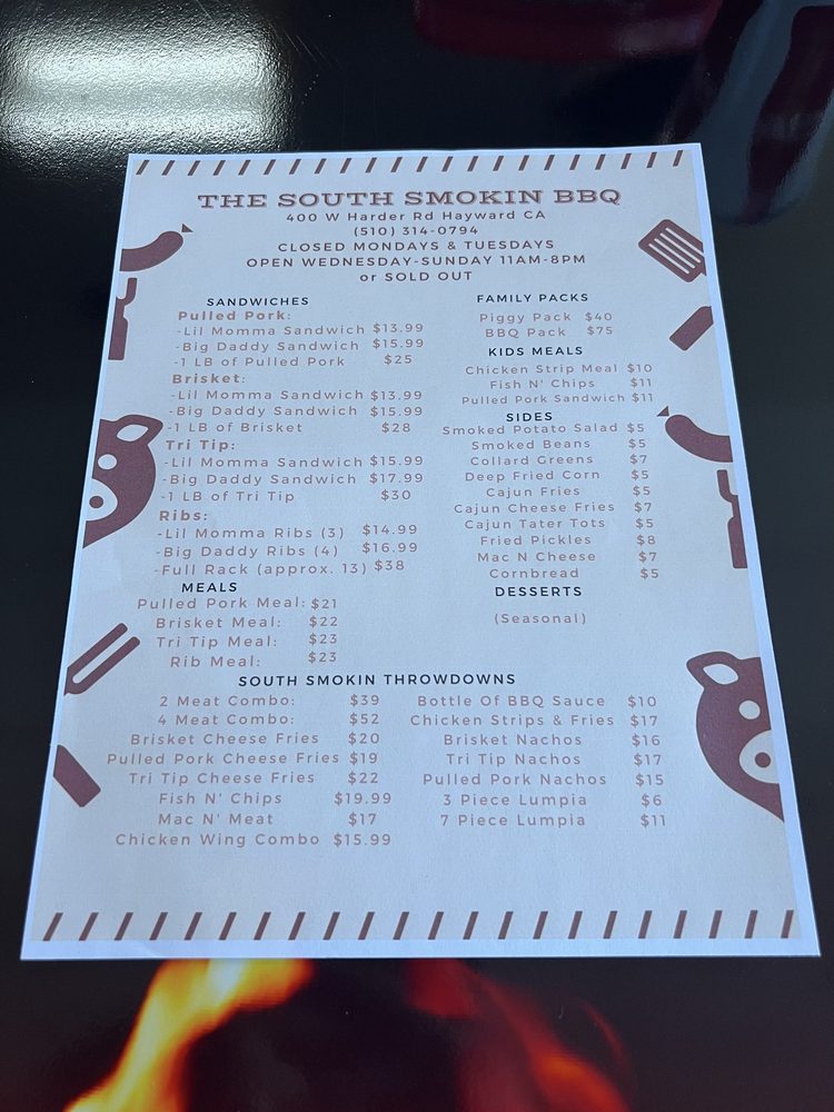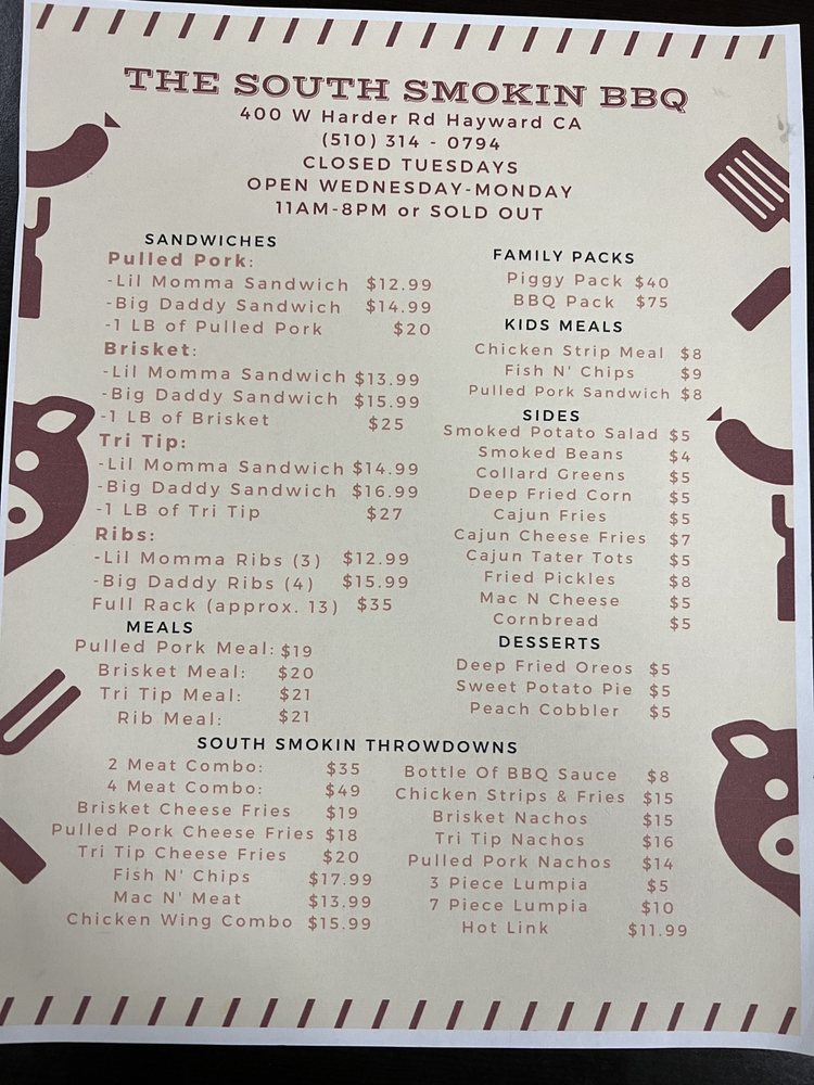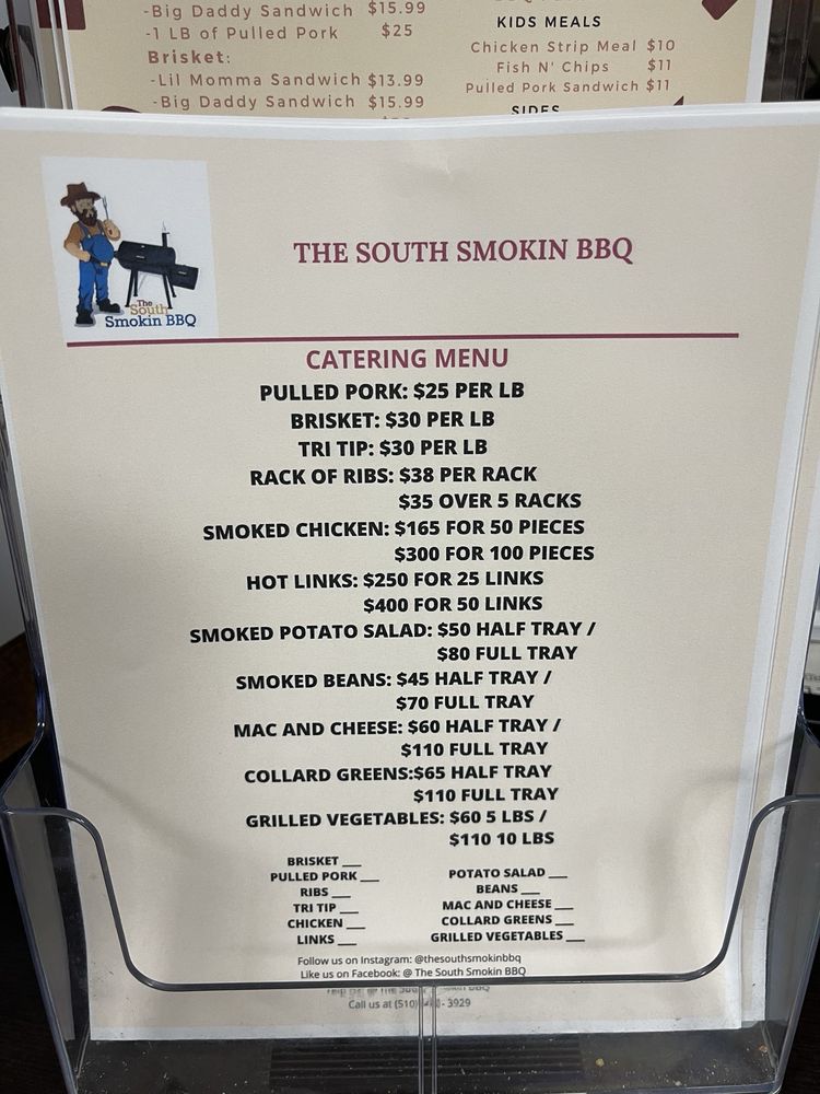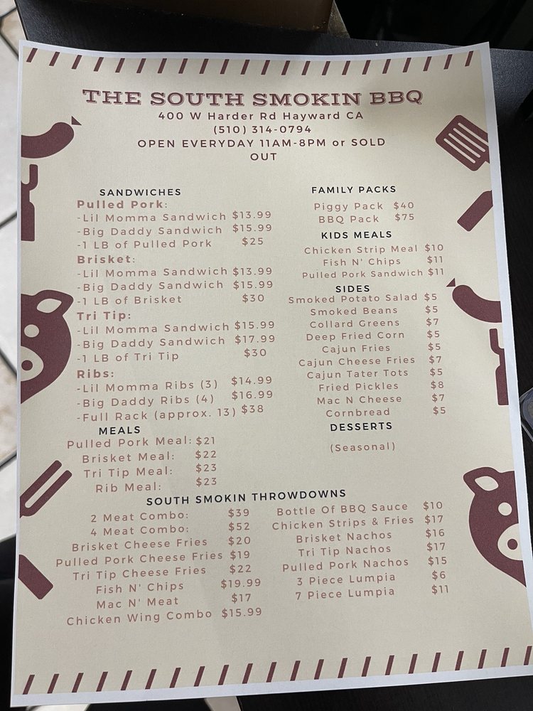 The South Smokin BBQ in Hayward, CA offers a diverse menu with options for everyone, including vegetarian choices. Their family packs provide a generous amount of delicious barbeque for groups, with the BBQ Pack, Hog Pack, and Piggy Pack being popular choices. Sides like Cajun Cheese Fries, Collard Greens, and Corn Bread offer delectable accompaniments to the main dishes. Kids can enjoy their meals as well, with options like the Kids Chicken Strip Meal and Kids Fish & Chip Meal. Customers rave about the welcoming atmosphere, excellent service, and flavorful dishes, with highlights such as the tri tip cheese fries, brisket, mac and cheese, and smoked potato salad standing out. The barbecue is praised for its tenderness, smokiness, and well-balanced flavors, making it a must-visit for barbecue enthusiasts in the Bay Area.
