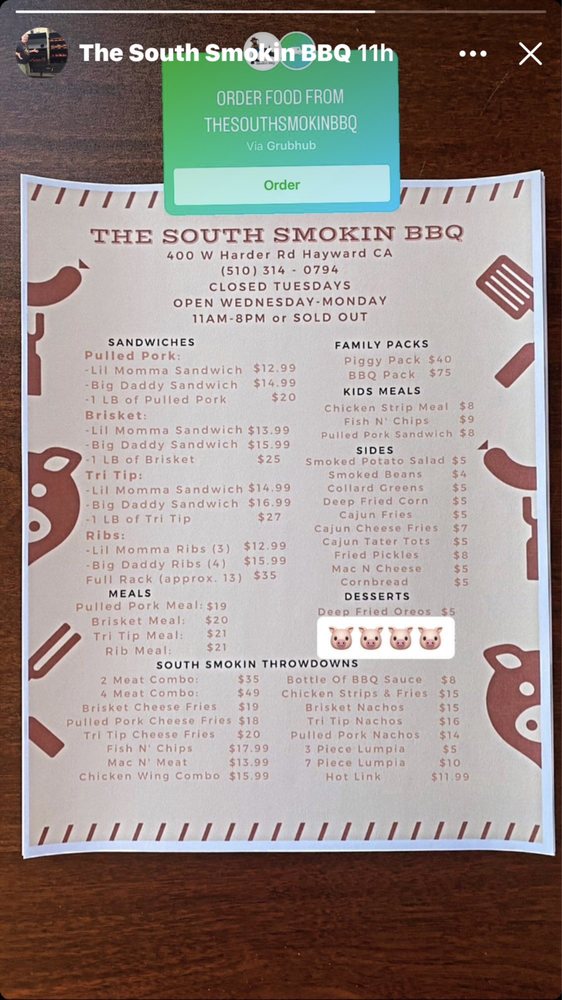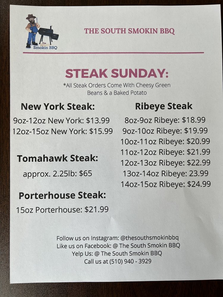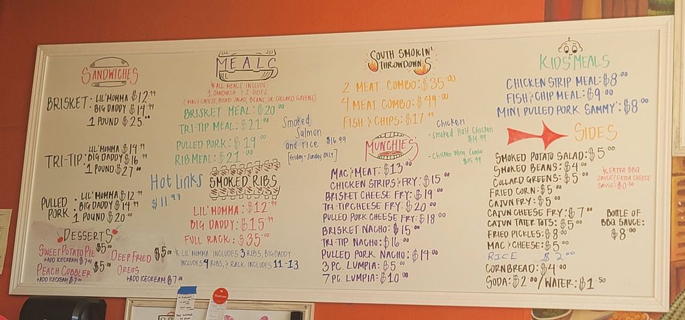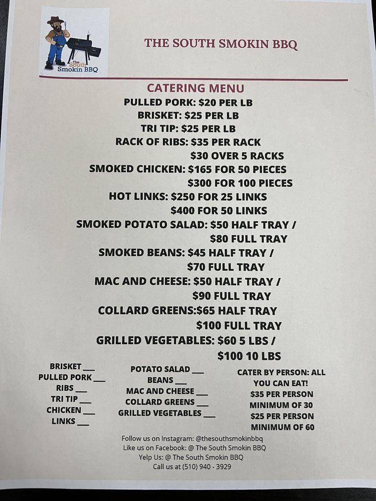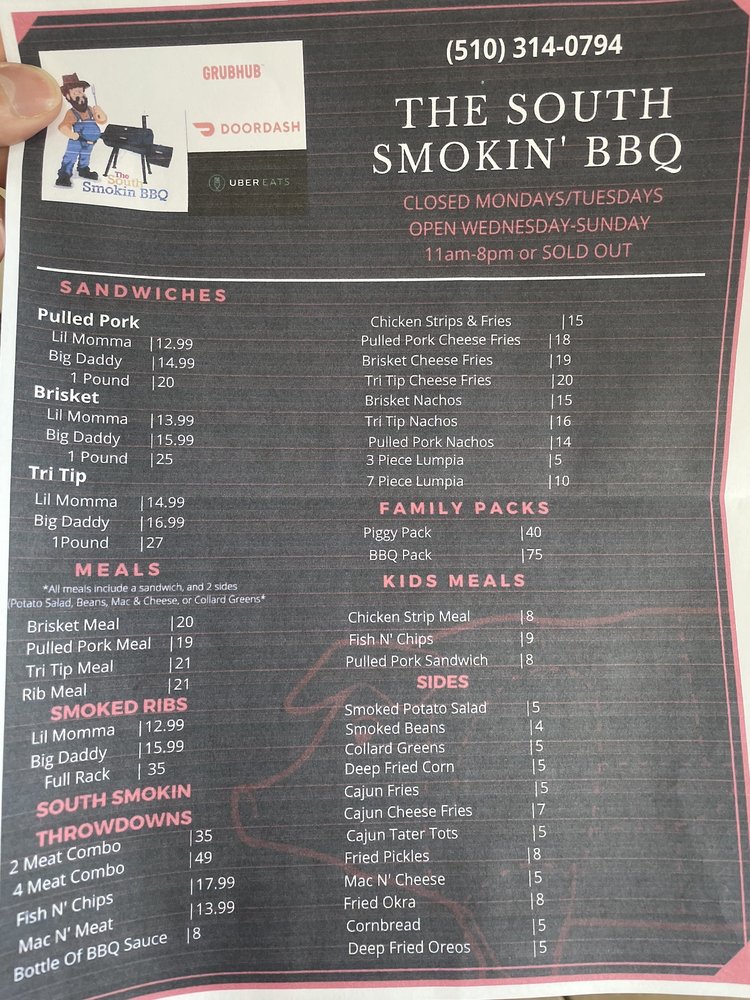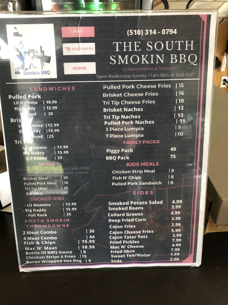 The South Smokin BBQ in Hayward, CA offers a diverse menu with options for everyone, including vegetarian choices. Their family packs provide a generous amount of delicious barbeque for groups, with the BBQ Pack, Hog Pack, and Piggy Pack being popular choices. Sides like Cajun Cheese Fries, Collard Greens, and Corn Bread offer delectable accompaniments to the main dishes. Kids can enjoy their meals as well, with options like the Kids Chicken Strip Meal and Kids Fish & Chip Meal. Customers rave about the welcoming atmosphere, excellent service, and flavorful dishes, with highlights such as the tri tip cheese fries, brisket, mac and cheese, and smoked potato salad standing out. The barbecue is praised for its tenderness, smokiness, and well-balanced flavors, making it a must-visit for barbecue enthusiasts in the Bay Area.